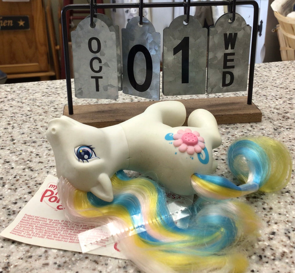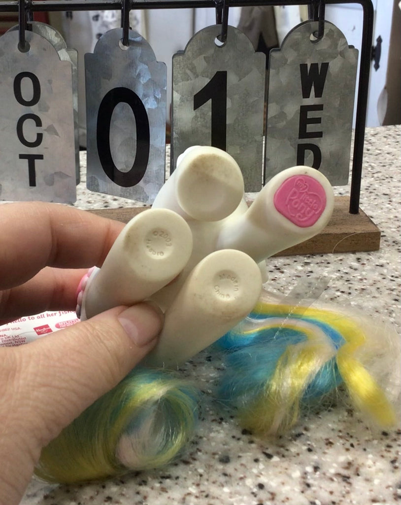 this pony is dusty and needs to be cleaned, and the light fragrance applied to her from the factory has discolored the body slightly, leaving it yellowed. Hair is still in original factory packaging, and the pony will come with the paper certificate.