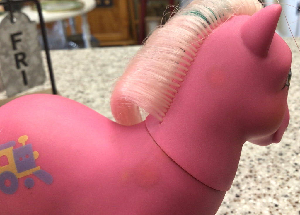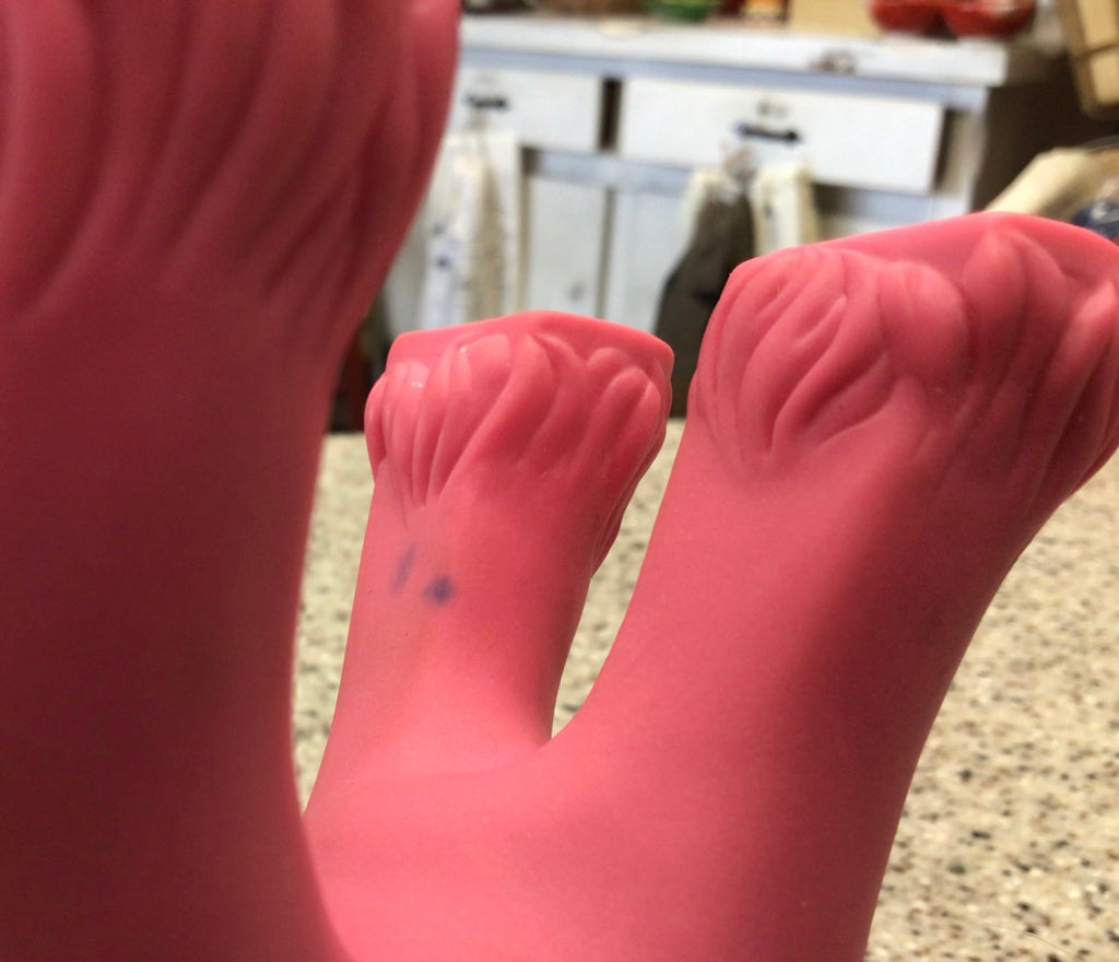 Steamer has a few issues, but is still very nice. Hair is nice and soft, still pink. However there are some permanent marks: initials on the bottoms of feet, 2 small spots on 1 leg, and some spots where the plastic is breaking down on his body, so please look closely at all the pictures.
